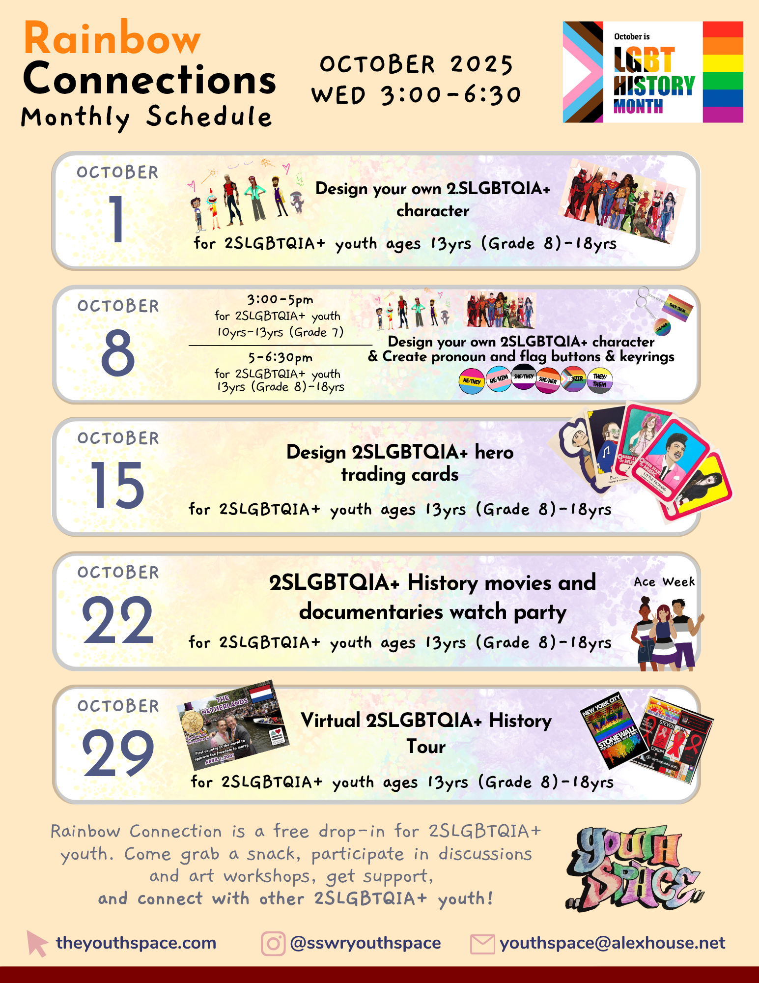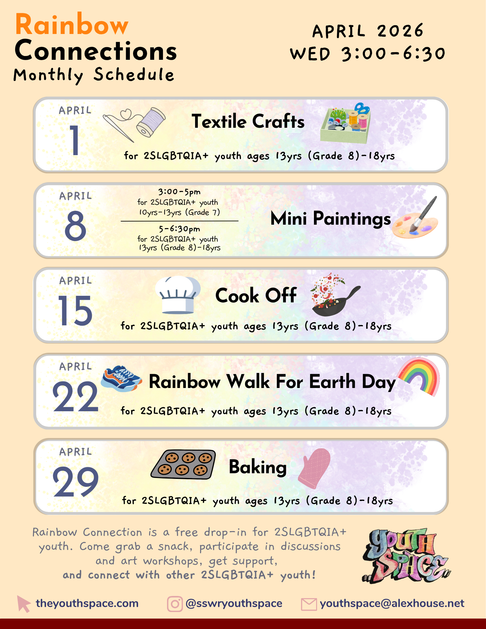 3:00-6:30 PM for 2SLGBTQIA+ youth aged 13 yrs (In grade 8) – 18 yrs